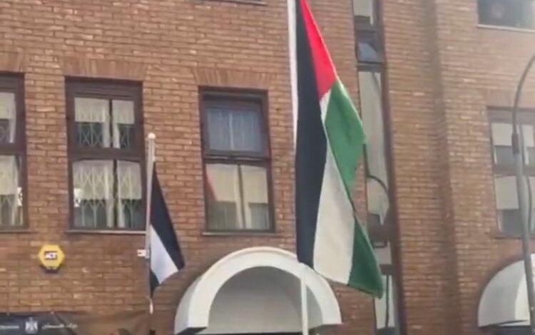 En Londres, el nuevo embajador Husam Zomlot izó la bandera palestina frente a la que ahora es oficialmente la embajada de Palestina en el barrio londinense de Hammersmith.