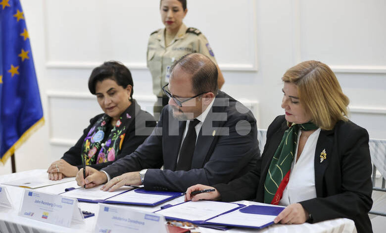 La firma estuvo a cargo del ministro del Interior, John Reimberg, y de la embajadora de la UE en Ecuador, Jekaterina Doródnova, y contó con la presencia de la ministra de Relaciones Exteriores y Movilidad Humana, Gabriela Sommerfeld, como testigo de honor, así como del jefe de Unidad para América del Sur de la Dirección General de Asociaciones Internacionales de la Comisión Europea, Olivier Luyckx.