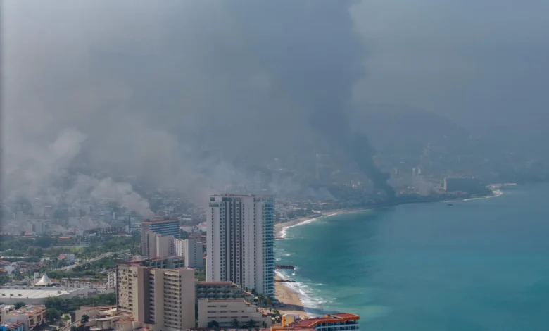 Foto aérea que muestra columnas de humo tras las reacciones violentas al asesinato de Oseguera Cervantes, en Puerto Vallarta, Jalisco/ EFE/STR
