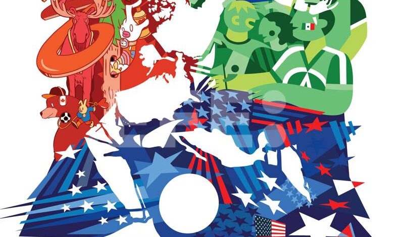 Con tonos rojos (Canadá), azules (EU) y verdes (México), la obra nació de la colaboración de artistas de los tres Estados: el canadiense Carson Ting, la mexicana Minerva GM y el estadounidense Hank Willis Thomas.