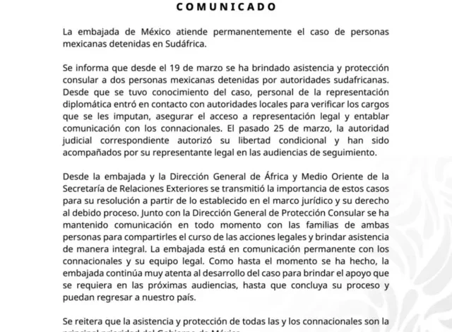 En su nota, la embajada señaló que, desde que conoció el caso, estableció contacto con autoridades sudafricanas para verificar los cargos que se les imputan, brindarles acceso a representación legal y mantener comunicación con los connacionales.